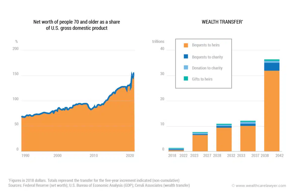 The Wall Street Journal gushes “Transfers to heirs and others are unleashing a torrent of economic activity, including buying homes, starting businesses and giving to charity.” According to the WSJ, the research and consulting firm Cerulli Associates estimates that between 2018 and 2042 older Americans will transfer approximately $70 trillion [i] . But to whom? Heirs, chiefly Generation Xers and Millennials, will receive the lion’s share, approximately $61 trillion, and the rest will go to philanthropy. But net worth is not a static or steadily increasing figure, especially after retirement. How do health care, long-term care expenditures, and taxes figure into this equation? The WSJ does not comment.